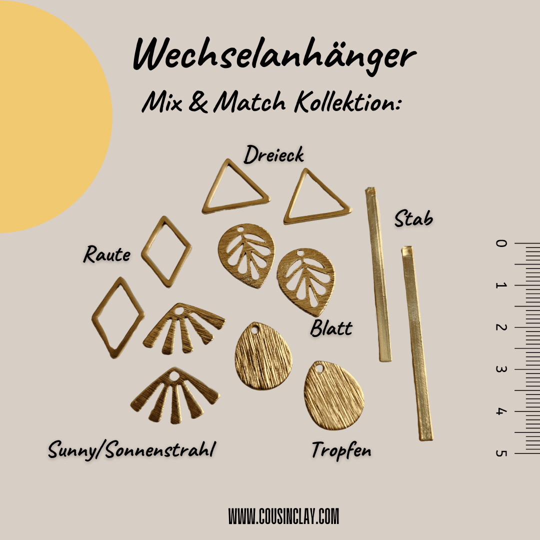 Darüber hinaus verwenden wir die Materialien: Polymer Clay (FIMO-Modelliermasse von STAEDLER), Edelstahl und Messing mit einer Goldbeschichtung, Acrylglas, Naturmaterialien sowie hautfreundliches Resin.