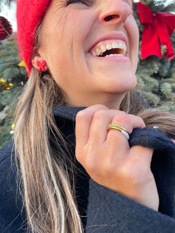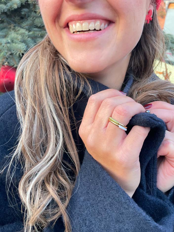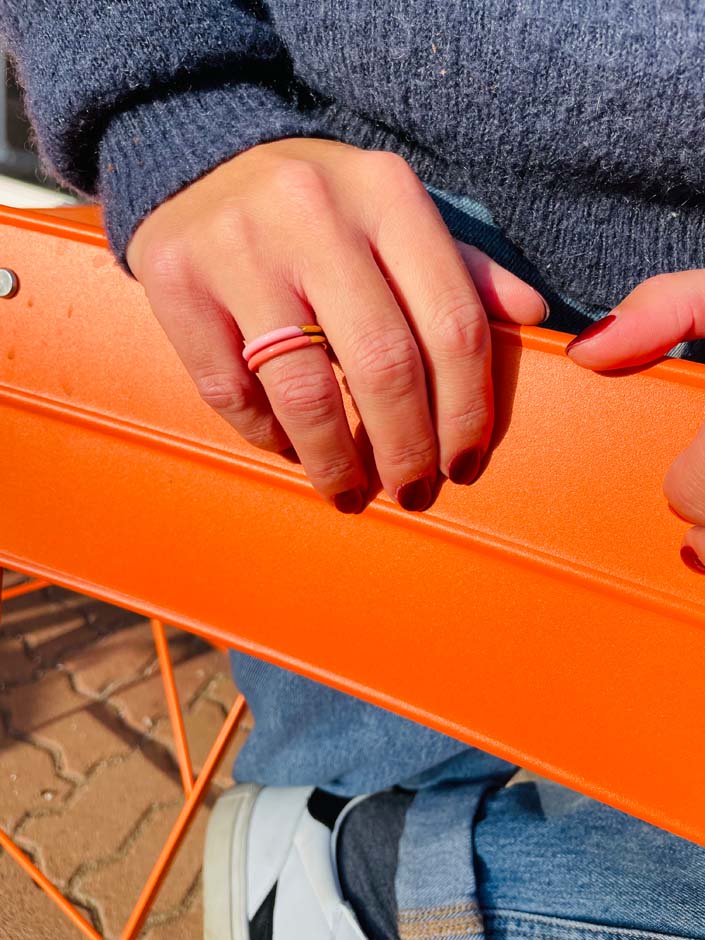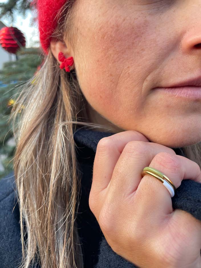 Die Statement-DUO-Ringe erstrahlen zur einen Hälfte in Gold oder Silber und zur anderen in Trendfarben. Dank ihrer schlichten, zarten Eleganz lassen sie sich wunderbar kombinieren und vielseitig stylen. Jeder Ring wird in sorgfältiger Handarbeit mit Emaille bemalt. Die Ringe sind in 4 Größen (52, 54, 56, 58) und in Gold oder Silber erhältlich.