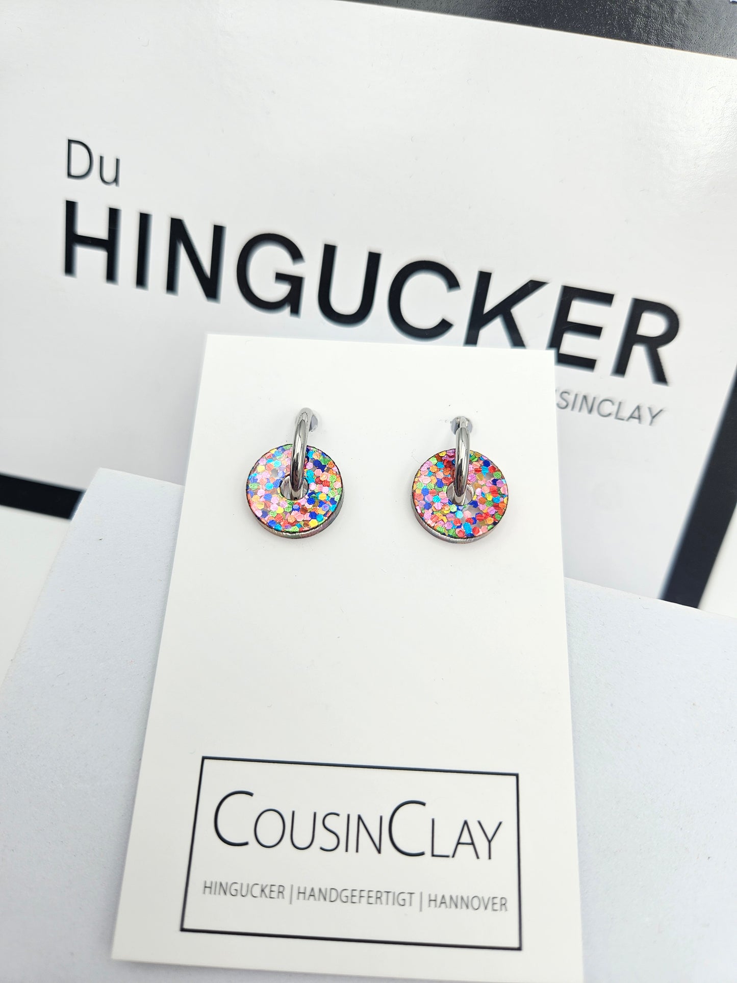 Da kommt einfach nur Freude auf! Creolen wählbar in Gold oder Silber mit glitzernden Anhängern (Herz, Tropfen, Donut/Kreis und Dreieck) aus Acrylglas, die in allen Farben des Regenbogens erstrahlen.